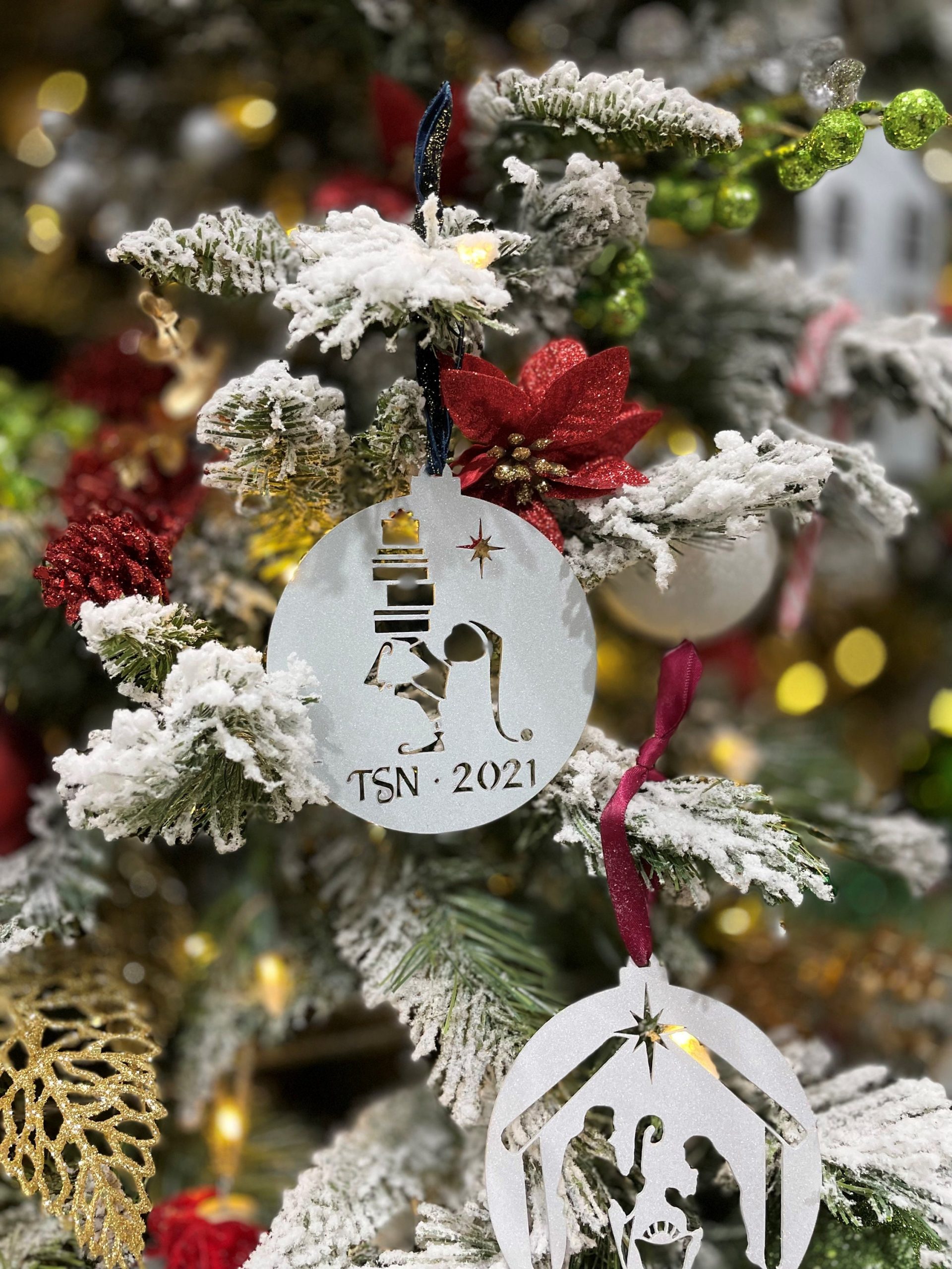 Each piece is designed and created from scratch in Durham, North Carolina from 14 gauge galvanized cold-formed steel (CFS). The ornament can be left unfinished, or sandblasted for a shimmer effect under lights. A ribbon is added for easy attachment to tree. Each ornament will go into it's own sleeve to protect from scratches during mailing.