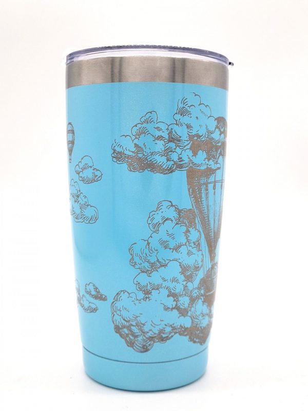 Hot air balloon sky scene WRAPS COMPLETELY AROUND this beautiful cup! This whimsical design will easily become a favorite tumbler for the dreamer in your life! Customize our 20oz tumblers with a logo or name in your font of choice! Laser engraving is permanent and will not wash off or wear out over time.